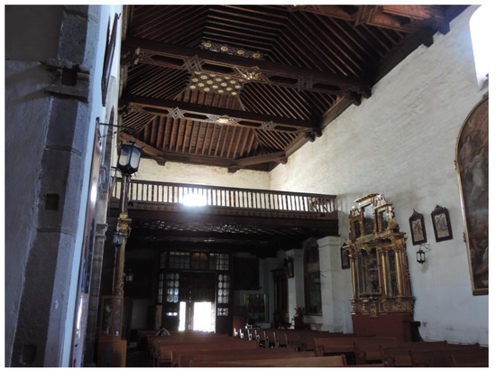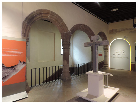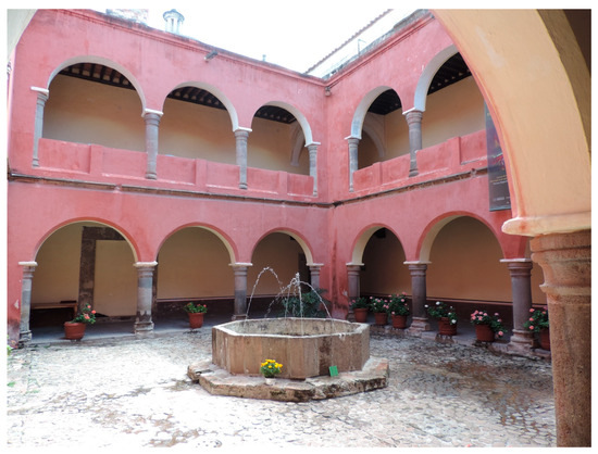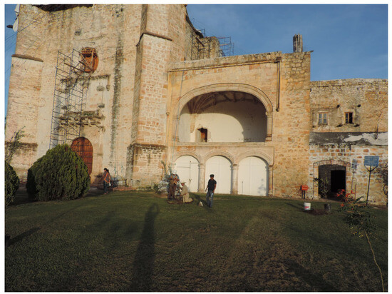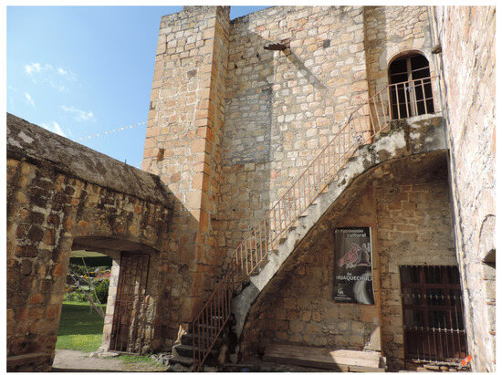 For example, on the west side of the upper floor of the monastery, there is a curious loggia that stands at the top of a modern staircase (Figure 6 and Figure 7). Aptly nicknamed the mirador and located at the threshold of the new quadrangle addition, the loggia once opened to the outside, thus revealing to people outside a stretch of the walkway that joined the old cloister (ca. 1553) and the new north quadrangle (after 1564) (Lockhart et al. 1986, p. 64), which could be accessed through a doorway (now sealed). The function of this loggia has puzzled scholars, who have previously considered the building only from the vantage point of the Franciscan priests (Leyva 2014, p. 96). Yet the mirador was poorly designed for contemplatives. The Franciscans would have realized that the mirador terrace exposed them to the prying eyes of anyone standing below in the monastery’s double atrium, thus making the mirador too public a place for meditation. Considering the mirador from the vantage point of the monastery’s Nahua staff, however, hints at another function. I suggest the mirador may have connected to a staircase that led to the walled inner courtyard directly in front of the expanded complex. If this was the case, the mirador would have been part of an exterior circulation system designed specifically for the use of Nahua workers.