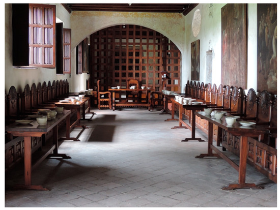 Mendieta’s story begins on a Friday evening in 1556. It was Lent, the penitential season when Catholics—living and dead—atone for their sins. Outside the Tlaxcala monastery, the atrium teemed with Nahua churchgoers who had come to make their annual confession. But inside the monastery, all was eerily quiet. A lay brother, Fray Miguel, carried a pitcher of water to the refectory (Figure 4a,b). At the opposite end of the refectory was the office, where the monastery’s books were kept. There, a mysterious figure entered. Although the strange visitor was dressed like Fray Miguel and the other Franciscan missionaries, in a brown tunic with a hood, the lay brother did not recognize him. Fray Miguel called out to the figure, but there was no answer. In distress, he went to the refectory office to investigate, but nobody was there. The sight of the figure must have been an illusion or trick, he thought. After all, the monastery’s three priests should have been, at that hour, hearing confessions in the church (García Icazbalceta 1941, vol. 2, pp. 133–34).3