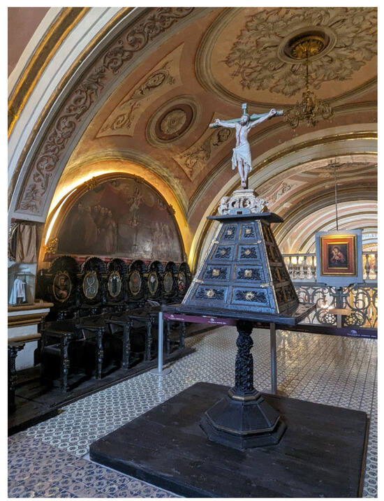 Fray Miguel’s senses were tested again when the ghostly apparition returned after Matins, the service chanted by the friars in the church at midnight. As Fray Miguel kneeled in prayer outside the choir enclosure, which originally stood in front of the high altar, he saw the hooded figure approaching, illuminated by the glow of the chancel lamp. Now “face to face,” Fray Miguel asked it a question, the answer to which he already knew: “Isn’t it you, Brother So-and-So, already dead?”4 “Yes, it’s me,” confirmed the spectral voice as it turned away from the lay brother and toward the tabernacle, the vessel in the high altar that reserved the Eucharist.5 “What are you looking for over there, brother?” Fray Miguel asked, as the ghostly figured gazed at the Eucharist—the consecrated wafer that is the body of Christ, and thus the most potent symbol of suffrage, or intercession. The figure mocked: “Well, you do not see what I am looking for?” and vanished.6 Suddenly alone in the dark church, Fray Miguel realized he had been visited by a ghost from purgatory. He left the church and went upstairs to the dormitory to report what he had seen and heard to the monastery’s highest-ranking member, the father guardian. Fray Miguel described to Fray Francisco de Lintorne the miracle he had witnessed in the choir. He explained that the purgatorial spirit had gestured to the Eucharist, which he understood as a request for the commemorative Masses and prayers that would release it from purgatory and send it to Heaven. Fray Francisco listened skeptically. He insisted the lay brother must have fallen asleep in the choir. Exhausted from the day’s work, maybe Fray Miguel was dreaming (MacCormack 1991, p. 43).7