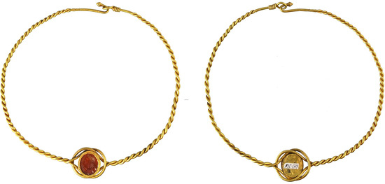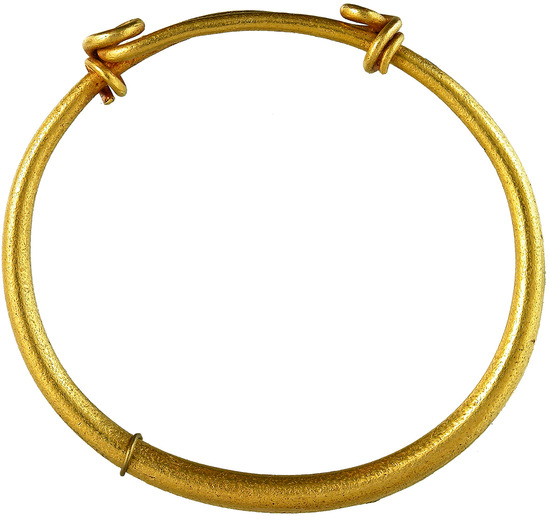 - A torque made of twisted wires that form an open-worked “Herakles knot” in the center, decorated with a carnelian intaglio and featuring the head of a young man (Apollo?) in left-profile with a kithara. Gold, carnelian.25 80.32 g; 164 × 170 mm; cast: 25 × 21 mm (stored in the NMHU Treasury Inv. No. A3C—1719; Figure 1, Figure 2 and Figure 3).