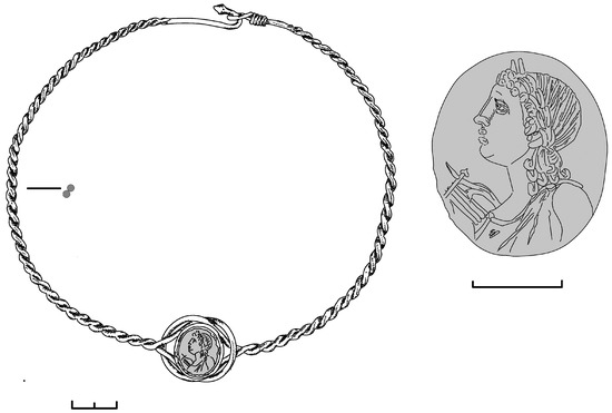 The torque (item no. 1 in the catalog) is a vivid illustration of this concept: it is a typically “Barbarian” piece of jewelry that symbolizes high status; however, it is decorated with a Greek “Herakles Knot” and an intaglio. An analogous piece depicting a “Herakles Knot” in the center, made using the same technique, comes from a male burial in a sarcophagus (crypt 2, sarcophagus 2 found in 1975 in Gorgippia (Treister 2003, pp. 45–46; Figure 11). There are no other attested objects similar to this type. Another well-known case of using a “Heracles knot” on torque is a decoration on the loop of a torque made of smooth, round wire from Chersonesus, dated to the second half of the 1st–2nd century CE.27 Numerous torques made from bronze false-twisted wire with smooth ends bent into a loop and hooks are known from the cities of the Crimea and they mostly date the 1st–early 2nd century CE; however, torques of this type survived until the 3rd century CE.28