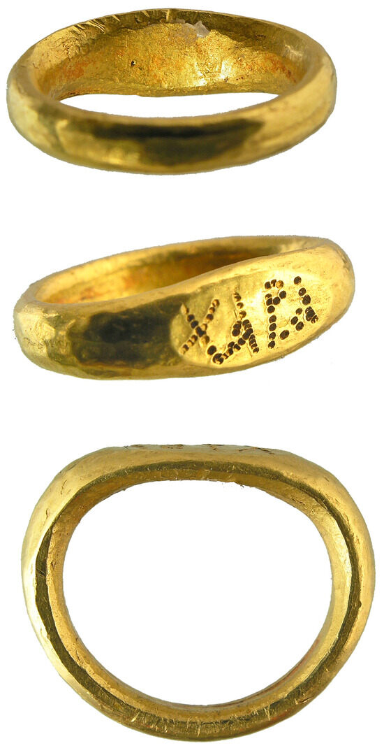 Michail Treister considers these rings as a “local Bosporan phenomenon” and assumes that they were produced in the Bosporus (Treister 2015b, pp. 154–55). Sergei Tokhtas’ev devoted a special study to the “χάρα” inscriptions that appear on rings. He noted that the wish “χάρα” meant roughly the same as “χαῖρε” if one uses the proper definition—“rejoice!” (i.e., “wearing this ring”) (Tokhtas’ev 2015, p. 203).