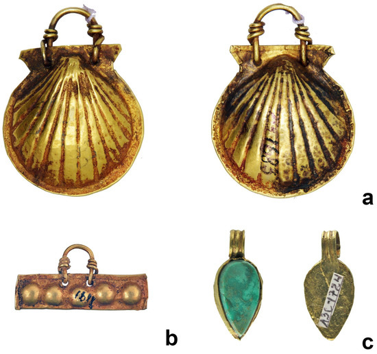 Figure 7. Pendants. (a)—pendant in the form of a scallop shell; (b)—rectangular pendant; (c)—drop-shaped pendant. Photograph by Dmytro Klochko. © National Museum of the History of Ukraine.