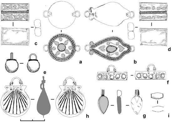 Figure 8. Necklace details. (a,b)—round and rhomboid-shaped plaques; (c,d)—double-tube decorations; (e–g)—pendants; (h)—pendant in the form of a scallop shell; pendants; (i)—bead. Drawn by Evgenia Velychko. - A pair of double-tube decorations with an ornament in the form of ivy leaves, teardrop- and round-shaped, lined with twisted wire and inlaid with green and blue enamel. Gold, enamel. 3.26 g, 3.06 g; 23 × 14 mm, 24 × 15 mm (stored in the NMHU Treasury; Inv. No. A3C—1720, A3C—1723; Figure 8c,d and Figure 9c,d).