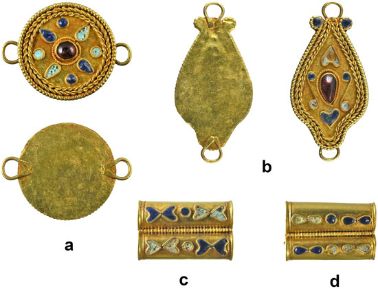 Figure 9. Necklace details. (a,b)—round and rhomboid-shaped plaques; (c,d)—double-tube decorations. Photograph by Dmytro Klochko. © National Museum of the History of Ukraine. - A pair of round and rhomboid-shaped plaques with loops. The surface is decorated with an ornament of S-shaped scrolls and drop-shaped figures made from thin wire, inlaid with enamel and red stone. Gold, garnet, enamel. 3.46 g, 3.97 g; 31 × 23 mm, 42 × 20 mm (stored in the NMHU Treasury; Inv. No. A3C—1721, A3C—1722; Figure 8a,b and Figure 9a,b).