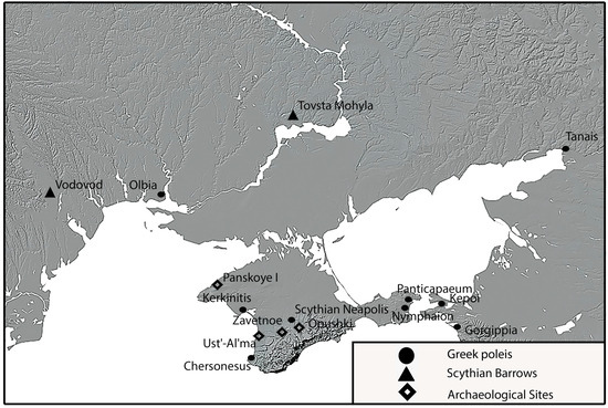 - Mordvintseva, Valentina Ivanovna. 2019. Scholarly Traditions in the Studies of the ‘Late Scythian Culture of the Crimea’ and ‘Crimean Scythia’. In Advances in Ancient Black Sea Studies: Historiography, Archaeology and Religion. Pontica et Mediterranea 8. Edited by Victor Cojocaru, Ligia Ruscu, Thibaut Castelli and Annamária-Izabella Pázsint. Cluj-Napoca: Mega Publishing House, pp. 179–97. [Google Scholar]