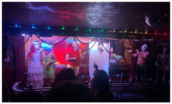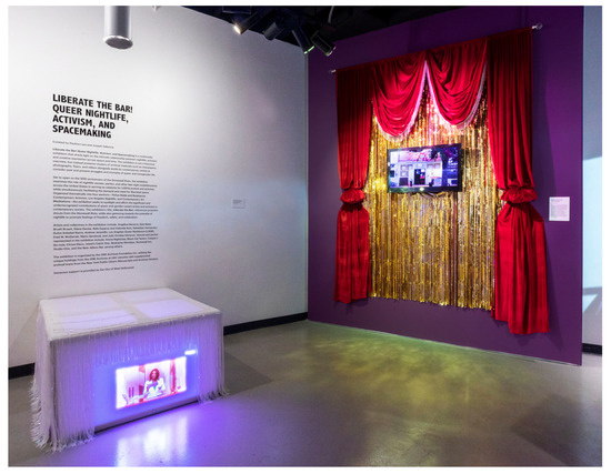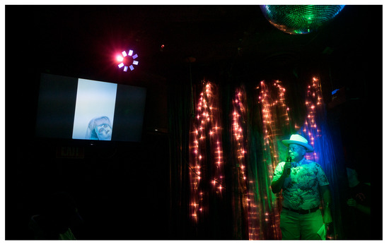 This article contributes to this highly dynamic and interdisciplinary field by prioritizing a focused discussion on the arts—that is visual art, performance art, and public art.5 As the late scholar–activist Horacio N. Roque Ramírez recognized through his oral history work and queer Latinx nightlife experiences in Los Angeles and San Francisco, it has long been the arts and creative organizing within gay bars that has helped to build community, raise consciousness, and fundraise around important LGBTQ+ issues (Roque Ramírez 2003). For example, the arts played an important role in Latinx gay bars of the 1990s and early 2000s, where theater and performance acts effectively engaged audiences and promoted positive messages about HIV prevention and sexual health education (Roque Ramírez 2007, pp. 287, 290). Acknowledging these histories underscores the longstanding and multifunctional role that queer nightlife has played in society and helps ground my study of the relationship between queer nightlife and contemporary art today.
