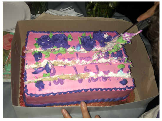 Music played throughout the performance, with each song dictating Hernandez’s and Ruiz’s movements. “San Cha started playing and Sebastian tried to seduce me”, recalled Ruiz (Ruiz 2018, pers. comm.). The music of the Chicana songstress evoked drama and love and ceased the duo’s animalistic behaviors.22 The performance then shifted into a love story and an elaborate courtship, as Hernandez danced around Ruiz and offered her orange foods such as Cheeto puffs (another blow to Donald Trump) in an effort to seduce her. Once Hernandez had successfully seduced Ruiz, the frenetic performance ended with the cutting of a beautiful pink sheet cake—one that read CYCLONA POR VIDA (CYCLONA FOR LIFE) (Figure 6).23