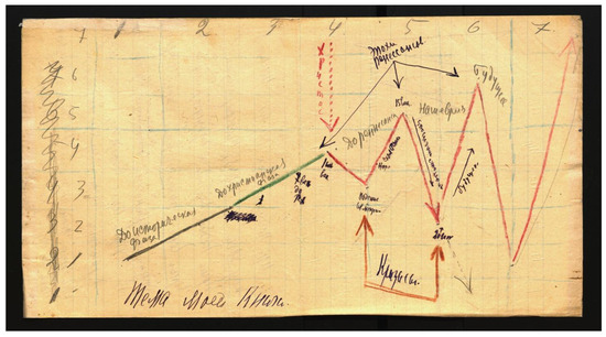 In 1928, Bely wrote a lengthy letter to an old acquaintance of his, a literary man and philosopher Peter Pertzov (“Answer to P. P. Pertzov”), that can be justly called a summary of HFSS. “Answer to P. P. Pertzov” includes multiple explanatory diagrams. In particular: