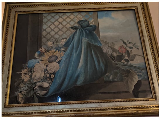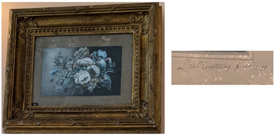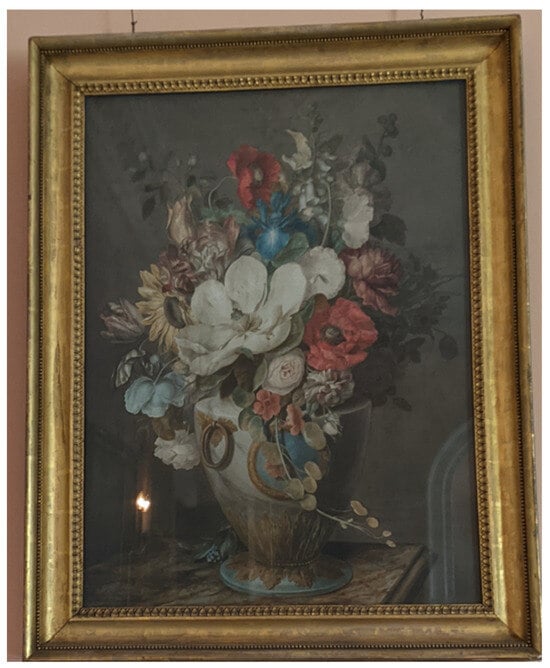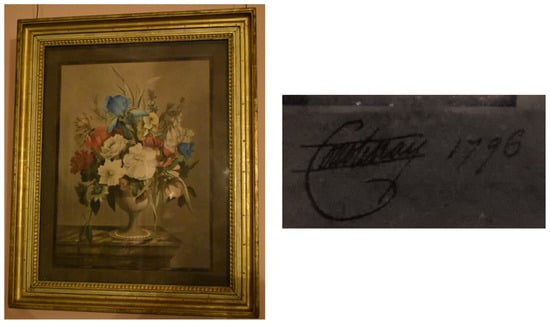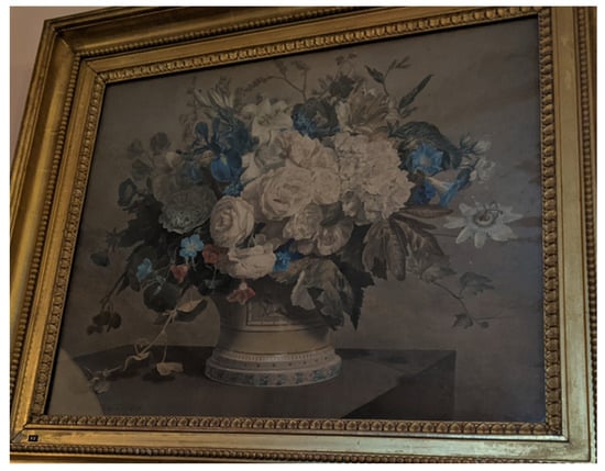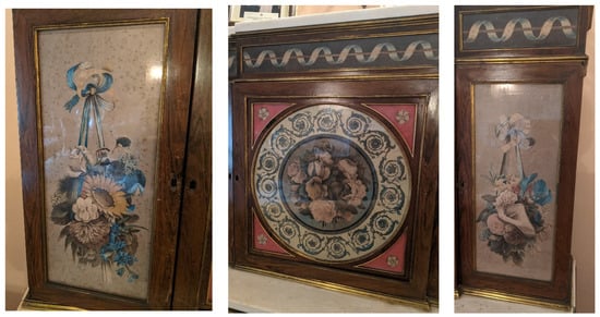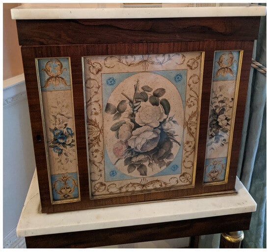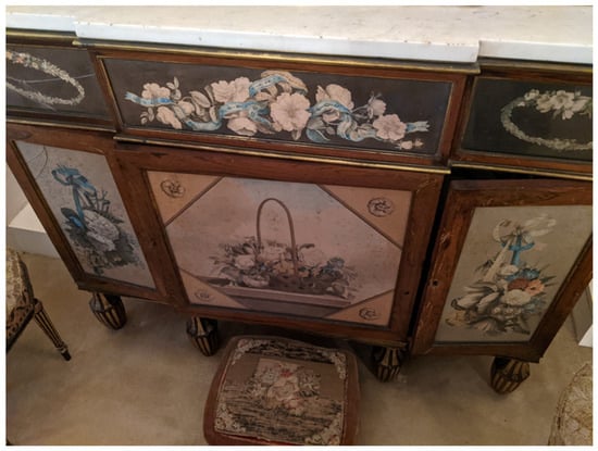 The interiors of Powderham were not only decorated with flowers and paintings of flowers; they also contained furniture decorated with floral motifs. The White Drawing Room at Powderham now also houses two cabinets painted by the 9th Earl (Figure 7, Figure 8 and Figure 9). Previous scholarship and contemporary accounts of the cabinets attribute them solely to the Earl, although mention is also made of the artistic activities of his sisters. Lady Pepys commented that the two painted cabinets were thought to be the work of the Earl. However, in the same sentence, she indicated that silk needlework inserted on a different marble-top table in the same room was the work of the Earl’s sisters (Pepys 1983, p. 25).