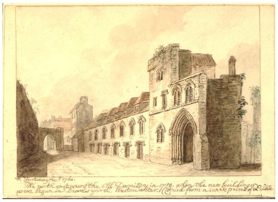 William Courtenay, 2nd Viscount Courtenay, A small view of the northeast of the old Dormitory in Westminster School, 1760. Watercolor, 7 cm × 10 cm. British Museum (1880, 1113.2528). Credit line: © The Trustees of the British Museum, Open Access Policy.