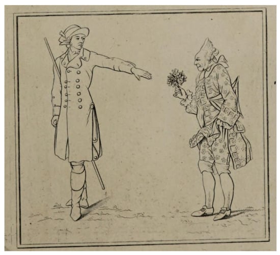 Visually, men perceived to be members of the “third sex” could be shown with female gestures and attributes. In some cases, this significantly included bouquets or floral-patterned clothing. In Thomas Holloway’s “Contrasted Attitudes of a Man and a Fribble,” for example, a man of the “third sex” is shown in extravagant dress holding a bunch of flowers (Figure 14). This engraving is in Johann Caspar Lavater’s Essays on Physiognomy (Lavater 1789, vol. 3, p. 213). Matthew Reeve argues that the tall, younger man in the image is the figure of the fribble’s affections, but his slenderness indicates that he is not a member of the “third sex,” given into moral decay. Reeve goes further in identifying the taller man as a representative of the manly classical column of the Doric order; this, as opposed to forms of Gothic architecture associated with members of the “third sex” (Reeve 2020, p. 140). If such stereotyped images can be associated with architectural forms and styles, then it is quite possible that they also represented other art practices or subjects. For members of the Earl’s aristocratic circle familiar with such images and descriptions of the fribble, the connection between the 9th Earl’s interest in flowers, his effeminate behavior, and his social interactions would have been readily evident.