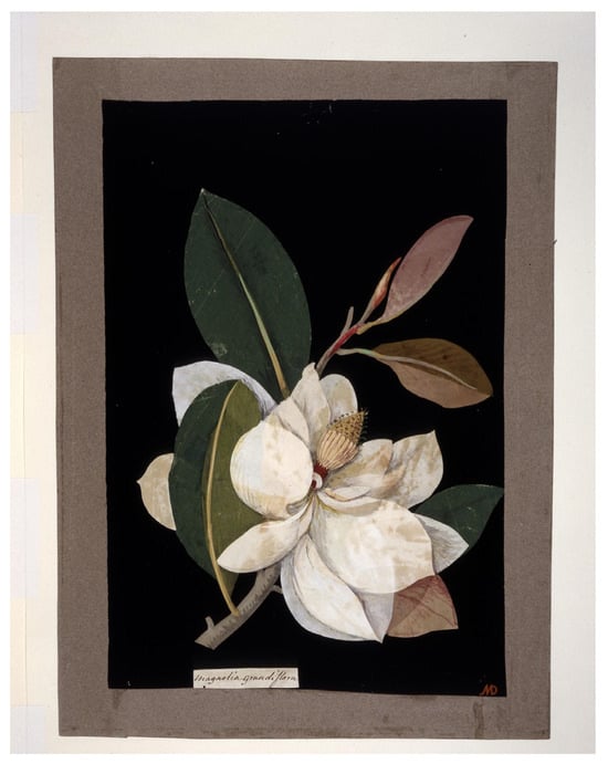 A few of the flowers depicted by the 9th Earl relate directly to plants which he cultivated at Powderham. For example, the main feature of another of the larger watercolors is a magnolia set in the center of an arrangement with a sunflower, poppies, roses, a foxglove, and an iris (Figure 11). The location and size of this magnolia bloom highlights its significance. Originating in the south-eastern part of North America, the magnolia grandiflora, commonly called the bull bay, was introduced to Britain around 1728 (Blacker 2000, p. 239). There is evidence that the Earl grew magnolia trees as part of his American garden at Powderham. In Arboretum et Fruticetum Britannicum, John Claudius Loudon wrote about a magnolia grandiflora or Southern Magnolia at Powderham in 1854 (Loudon 1854, p. 63). Likewise, a description of the plants in the American garden in the 1882 Gardeners Chronicle states that the “Magnolias grow and flower as freely as the commonest Rhododendron” (Anonymous 1882, p. 590). Rebecca Flemer has rightly pointed out that from this later description, the date of the original planting of the garden is unclear (Flemer 2018, p. 98). However, the life span of a magnolia is long enough for these to have been potentially planted by the Earl.