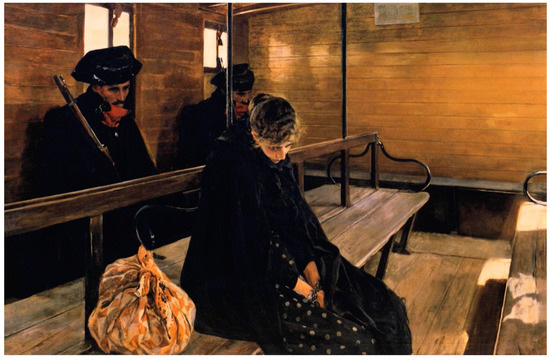 From 1892 to 1895, Sorolla created three canvases with their own distinct characters, stories, dramas, and tragedies. Another Marguerite! (Figure 5) depicts a solitary young woman who has been handcuffed by the Civil Guard officers who are escorting her by train, presumably for a trial, since she is accused of killing the child she bore out of wedlock. And They Still Say Fish is Expensive (Figure 6) shows a young sailor who has been gravely injured as the result of a fishing accident and who is being attended to below deck by his shipmates, while in White Slave Trade (Figure 7), several young girls are traveling by train from a rural location with an older woman who is their procuress, implying that upon arriving at their destination in a city, they will be involved in sex work.39 While still moving, the tragedies in these canvases are quieter, more somber, and less visually scathing than Sad Inheritance!, which was the culmination and last example of this genre in Sorolla’s oeuvre.