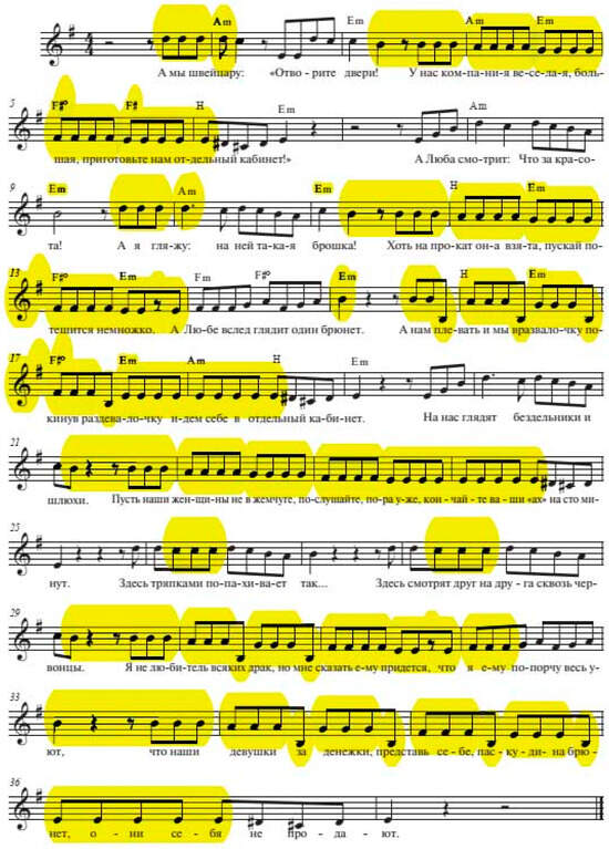 I have not found a published musical notation of the song and am using one made at my request by P.A. Berliand, who, for the sake of convenience, has transposed the A minor of the author’s performance a quint higher—to E minor.