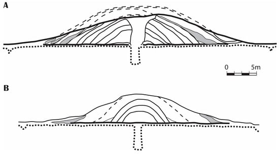 In The Chimera Principle, Carlos Severi (2015, p. 4) employs Wittgenstein’s visual illusion of a rabbit–duck to demonstrate that what one sees (and, by extension, experiences) is largely dependent on how our vision and memory are culturally shaped and usually overlap. Indeed, without any external adornment such as menhir (standing stones) or stelae on top or situated around the exterior of the mound, burial mounds can look (more or less) like natural hills. Interestingly enough, and perhaps this is one of the points Wittgenstein was trying to make, without having much internal detail (or external detail besides an outline) at our disposal, it becomes a matter of experience and memory in terms of identifying one thing or another. In the study presented here, it is much the same, except replacing a hill and burial mound for a rabbit and duck. Severi’s point is that without direct experience of the one (ritual and cultural in nature) over the other (being naturally made), we might mistake one for the other. But with cultural memory and imagination firmly in mind via specific ritual events that remind or even emphasize specific spacetimes to certain audiences, we can begin to fill in the burial mound’s outline. From a close, exterior perspective, burial mounds reveal little evidence of different intentions in terms of single uses and/or reuse over time (Figure 1). Their outlines, beyond overall size, are often similar if not identical in shape, and from a diachronic perspective with the effects of time taking their toll on mounds (like slumping), match those of natural hills. But these different spacetimes (cultural and natural) are often more distinct at certain times and elusive in others. For instance, the primary difference emerges right after a mound’s construction. Following its immediate use, and possibly reuse, the mound lays bare, denuded of most of the vegetation that would have grown on the surface, just as various types of plants take root on hills. Over time, the mound will increasingly take on the appearance of a hill, especially as natural forces and elements take hold. The growth of vegetation, erosion, and slumping might change the shape of the mound and may, in fact, change the internal composition as well, i.e., bioturbation (Figure 1 and Figure 2). We might imagine that at least upon completion, and shortly after, the intentions of the “container” form itself were protean, signaling an artificial form at the start but becoming increasingly naturalized over time, perhaps an artifice to further protect the interior from intentional disturbance, like looting.