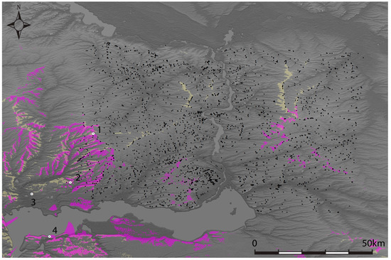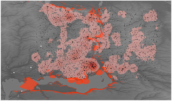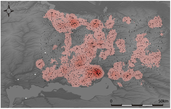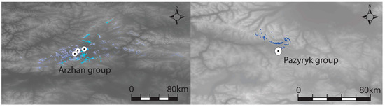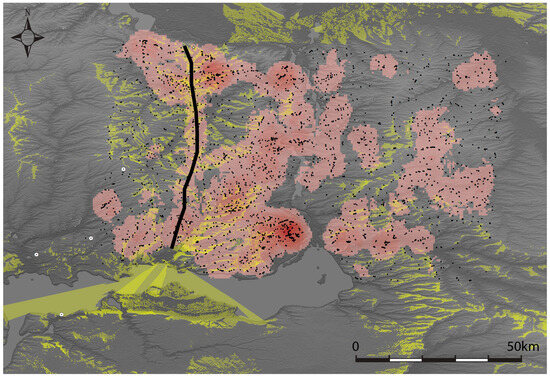 While the image depicts the collected viewsheds from three monuments of the group (Arzhan 1, Arzhan 2, and Tunnug 1) (Figure 6), there is clear indication that the mounds within the group, while several km apart, could have been seen from up to 80–120 km away, representing a regional engagement in terms of visibility, memory, and cultural imagination. Located in the Tuva region, Iron Age pastoralists would not have had to travel too far to find a vantage point within the immediate or even extended area to visually engage with the mounds, with the viewsheds themselves being suggestive of a broader east–west orientation.