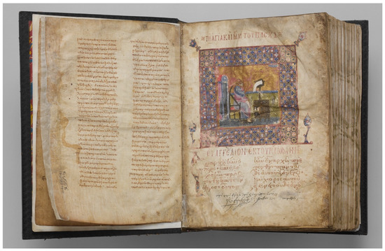 | 57 | Gospel Lectionary with Marginal Illuminations, Middle Byzantine, second half of 11th century CE. 12 3/16 × 9 ¾ × 2 7/8 inches (32.6 × 24.8 × 7.3 cm). Dumbarton Oaks Research Library and Collection, MS 1, BZ.1939.12. I am grateful to Elizabeth Dospěl Williams and Carla Galfano at Dumbarton Oaks for facilitating my research visit and permitting me to examine this manuscript, which took place on October 26–27, 2021. This manuscript is described by (Kavrus-Hoffmann 1996, pp. 289–31). |