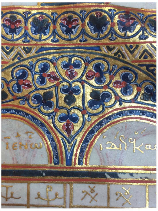 Detail of a Canon Table, from a Byzantine Gospel Book, late 13th century CE. Tempera, gold, and ink on parchment. J. Paul Getty Museum, Los Angeles (Ms. 65, fol. 7v/98.MB151).