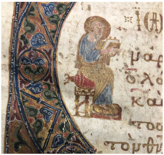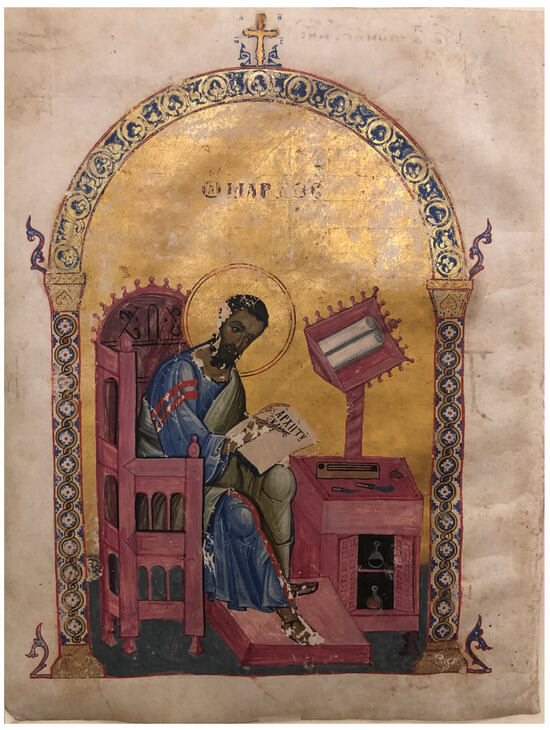 Evangelist Portrait of Mark, on a folio from a Gospel Lectionary (Athens, National Library of Greece, MS 2552), early 11th century CE. Ink, pigments, and gold on parchment. The Walters Art Museum, Baltimore (W.530.A).
