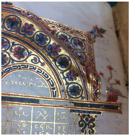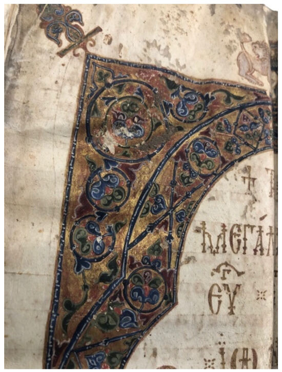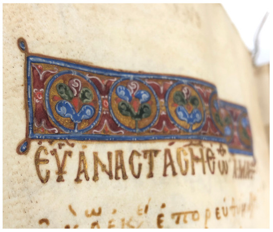 Pi-Shaped Heading for the Opening of the Gospel of Matthew, detail from the Lectionary of Katherine Komnena, ca. 1063 CE. Ink, tempera, and gold leaf on parchment. Dumbarton Oaks Research Library and Collection (BZ.1979.31.2).