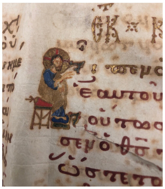 Historiated Initial with Christ, detail in the Dumbarton Oaks Lectionary, second half of 11th century CE. Dumbarton Oaks Research Library and Collection, Washington, D.C. (BZ.1939.12, MS 1, fol. 10v).