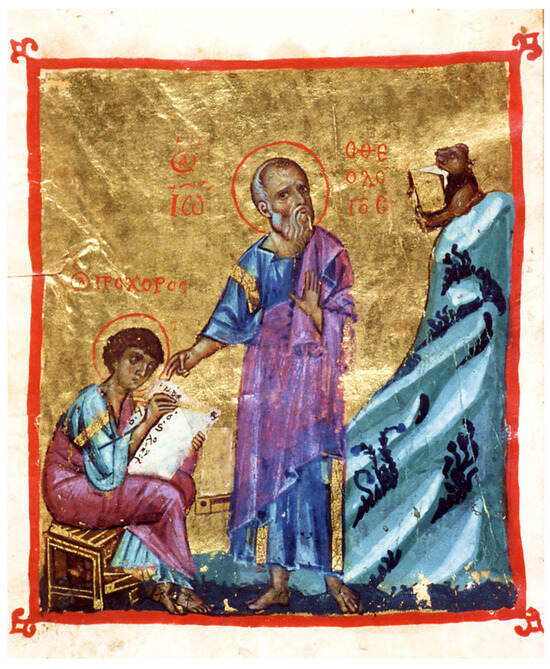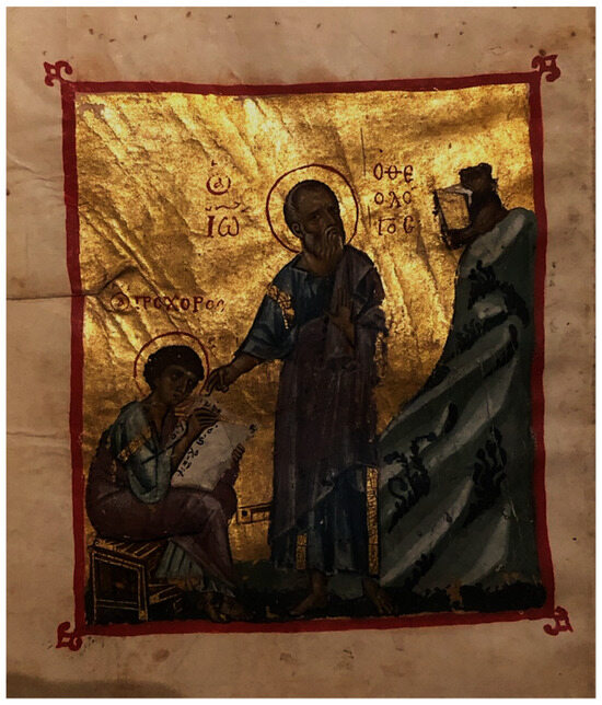 Manuscript leaf with St. John and Prochoros, 13th century CE. Dumbarton Oaks, Washington, D.C. (BZ.1958.105).