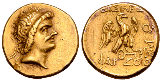 (Not to scale) stater of King Pharzoios with an eagle holding a tamga sign. Struck ca. 50–75 CE, AV Stater, 8.28 g, 18 mm. Auction XIX Day 1, 26 March 2020, Lot 86. With kind permission of Roma Numismatic Limited.