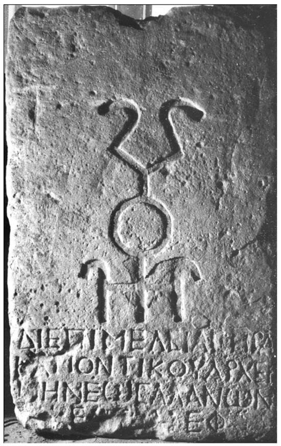 Stone slabs with royal tamgas were discovered in several locations of the Bosporan Kingdom. Almost all examples, except for two from Panticapaeum (Solomonik 1959, Figures 2 and 5, pp. 50–52), come from the eastern (Asiatic) part of the kingdom, with the majority originating from Tanais (CIRB 1237; 1241; 1248; 1249; 1250; 1251; Böttger et al. 2002). Other findings originate from Hermonassa (CIRB 1053; Solomonik 1959, Figures 3 and 4, pp. 51–52), Phanagoria (Kuznetsov 2008), and Khutor Krasnaya Batereya in the Kuban River basin, about 65 km east of Phanagoria (Solomonik 1959, Figure 6, p. 54). As previously mentioned, stone stelae with royal tamgas can be divided into two main groups: those with accompanying Greek inscriptions and those with just the sign (uninscribed). Almost all texts that accompany royal symbols are building inscriptions, describing the construction or repair of walls, towers, and other structures. They can also be partially considered honorific, typically with the aim of presenting influential people and their activities for the city. The inscription from Hermonassa, dated 208 CE, informs about the construction of a building by a certain Herakas, son of Pontikos, the chief translator of the Alans. It bears the mark of Sauromates II (Figure 3 = CIRB 1053). Other building inscriptions come from Tanais and bear the marks of Eupator (Figure 4 = CIRB 1241), Rhescuporis III (Figure 5 = CIRB 1248), and Ininthimaeus (Figure 6 = CIRB 1249 and Figure 7 = CIRB 1250). It is worth mentioning another lost inscription from Tanais, dated 193 CE and presented by Zenon, son of Zenon—the royal envoy to the city. On the inscription, according to the surviving drawing, a dedication text to Zeus, Ares, and Aphrodite was present (CIRB 1237 = Solomonik 1959, Figure 12, p. 59). Besides the dedication, the inscription also has honorific features, as it celebrates the victories of King Sauromates II over the Syraci, Scythians, and pirates, enabling navigation through the Black Sea to Pontus and Bithynia. In the lower left corner, a small tamga of the ruler was also present on the stone.