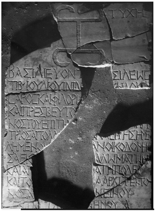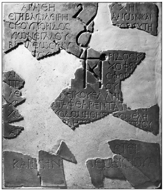 The function of the royal sign accompanying the Greek inscription is difficult to determine definitively. One possibility is that it could have been used as an alternative to the king’s titles. For example, the building inscription from Hermonassa does not reference the ruler in the text. In this case, according to an interesting interpretation by Shkorpil, the royal sign could have acted as an equivalent to the standard formula “βασιλεύοντος βασιλέως Τιβερίου Ἰουλίου Σαυρομάτου φιλοκαίσαρος καὶ φιλορωμαίου, εὐσεβοῦς,” which can be translated as “During the reign of King Tiberius Iulius Sauromates, pious friend of Caesar and friend of Romans” (Shkorpil 1910, pp. 32–34). However, on other inscriptions, despite the inclusion of the sign in the text, references to the rulers’ titles are present. These include both elaborate “pro-Roman” formulas and single names of rulers (CIRB 1248; 1251), which make finding a uniform pattern difficult.