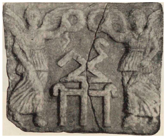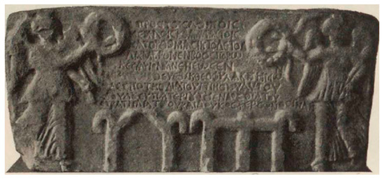The second subcategory belongs only to two examples of uninscribed slabs with royal signs from Hermonassa (Taman), which are presented along with Victoria figures holding wreaths above them. One of these slabs can have a connection to Tiberius Iulius Eupator (Solomonik 1959, Figure 3, pp. 51–52 = Figure 11), while the identification of the second is problematic due to the removal of the top part of the signs and their replacement with an inscription dated to the 5th/6th centuries CE (Solomonik 1959, Figure 4, pp. 52–53 = Figure 12). Interestingly, on this slab, two signs appear next to each other, with the base of one differing from the typical Tiberii Iulii “inverted trident.” This sign has only two “legs,” which may indicate that it possibly belonged to a relative of the ruler or his son (Treister 2011, pp. 314–15).19 The figure of Victoria/Nike was present in the iconography of the Bosporus even during the time of Asander (second half of the 1st century BCE)20 and later during the reign of the Tiberii Iulii dynasty. An interesting example is the relief from Panticapaeum, where Victoria hovers with a wreath over the figure of the man—perhaps a ruler (Treister 2011, pp. 323–25). Therefore, these slabs should instead be associated with honorific activity and may refer to military victories that the Bosporan kings achieved, as in the case of the earlier-mentioned dedication with the sign of Sauromates II.