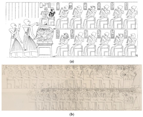 (a) Drawing of the rows of kings scene from TT 19 (Champollion 1845, pl. CLXXXIV) (b) Drawing of the rows of kings scene from TT 2 (Lepsius 1849–1858, p. 2[a]).