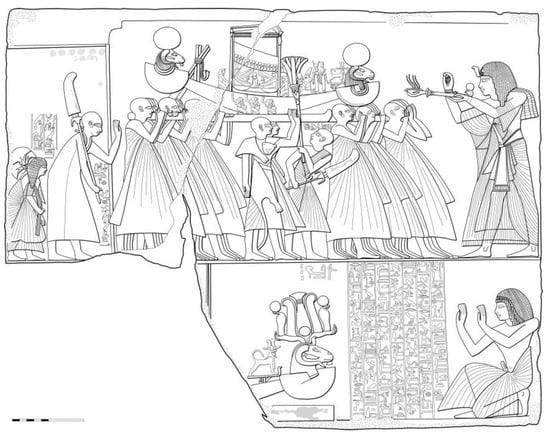 Relief CGC 35053, dated to before the 5th year of Ramesses II and most likely from the decoration of a tomb at Deir el-Medina, shows, in the upper register, the Userhat-Amen boat carried on the shoulders of the vizier Paser, the royal scribe Ameneminet, and the monarch, Ramesses II, making libations to the boat. In the lower register, Ameneminet, a member of Deir el-Medina, kneels in front of the boat and addresses an Amen-Ra prayer to it (Galán and Menéndez 2018, pp. 147–52) (Figure 5). This fragment, which would have come from a tomb, is yet another example of the owner’s link to this type of event, but also of the presence of important figures during the celebration of the festival. We do not know the connection of this individual with the cult of Amen, but it would be none other than to vindicate the divinity as the patron god, some thirty years after the Amarna Period and when the situation in Thebes seemed to have fully recovered.