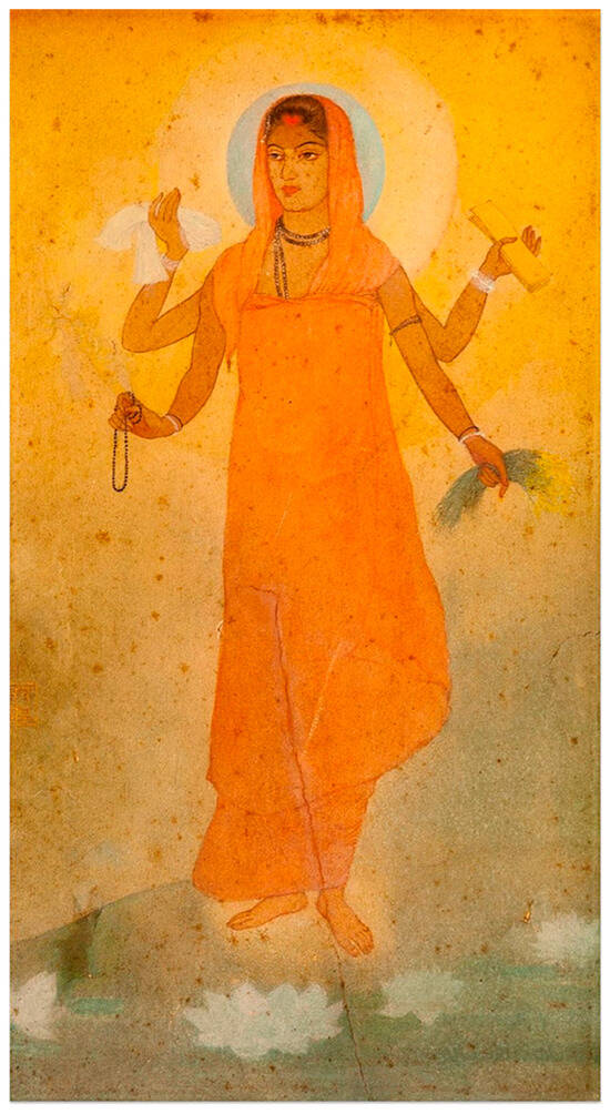 Around the same time that Taikan produced his two paintings, Shunsō also experimented with Indian-themed paintings, evidenced by his depiction of the Indo–Japanese Buddhist deity in Benzaiten (Figure 6), a Buddhist goddess that came from East Asian interpretations of the Hindu goddess of learning, Sarasvati. By choosing a goddess that is simultaneously Japanese and Indian, Shunsō depicted the spiritual and cultural unity between the two Asian countries. Additionally, not unlike Taikan’s Indian Guardian, Shunsō’s Benzaiten figure took inspiration from widely circulated images of Sarasvati in India, such as a popular lithograph produced by Calcutta Art Studio (Figure 7). Unlike Taikan, however, Shunsō directly molded his figure after the lithograph image, with his Benzaiten having the same pose as Sarasvati from the lithograph (Satō 2010, pp. 3–4). Furthermore, he also incorporated various signs from the lithograph into his painting to make his figure unmistakably Indian. For example, the goddess holds an Indian vina (a lute-like instrument) and wears a sari with jewelry adornments. While Shunsō’s figure mimicked the adornments and pose of the lithograph’s Sarasvati, its face and clothing diverged from it. Instead of the large eyes of the lithograph figure, Shunsō depicted Benzaiten with slender eyes, giving her an appearance more Japanese than Indian. He also painted his figure in simple white translucent cloths rather than the colorful red and orange attire worn by the lithograph figure. While it is unclear if Shunsō purposefully depicted Benzaiten with Japanese features or simply used a familiar style, his painting revealed how while he referenced Indian images more than Taikan, he also could not help but apply his personal touches just like his colleague.