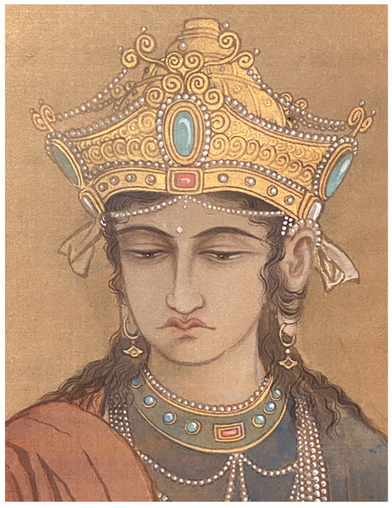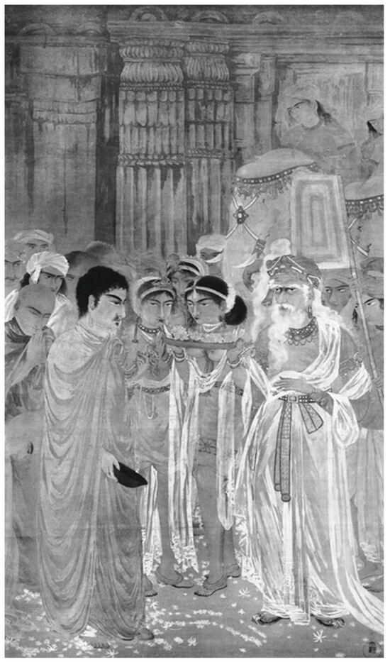 If we compare the head of Shōkin’s Śākyamuni (Figure 18) with the figure from Ajanta, we can see several resemblances. Both Shōkin’s and Ajanta’s figures feature a dark-skinned male with long slender eyes and long black hair matted onto the shoulders. The elaborate crown that Śākyamuni wore in Shōkin’s painting also resembled the one worn by the Buddha figure from Ajanta, with strings of pearls hanging from it (Narihara 2005, p. 557). Just as Taikan and Shunsō referenced contemporary Indian art and observations of Indian locals to construct their figures, Shōkin looked towards both Ajanta’s ancient paintings and the body of an Indian man to create his idealized version of the young Śākyamuni. In doing so, he portrayed the Buddha, not as the cosmic entity worshipped in Japan for many years, but as a historical figure.