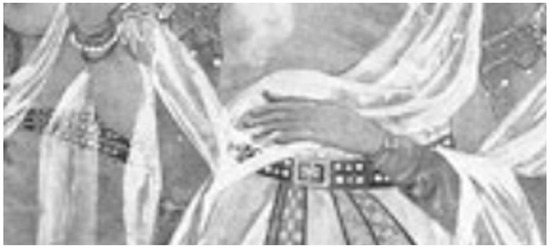 In Taikan’s case, he used Ajanta as a reference to construct his image of Sākyamuni, best evidenced in his now-lost 1903 painting Śākyamuni Encounters his Father (Shaka chi chi ni au, Figure 11), displayed at the 15th Exhibition organized by the Competitive Painting Association (Kaiga Kyōshinkai 絵画共進会) organized by the Japanese Painting Association (Ibarakiken Yokoyama Taikan Denki Hensan Iinkai 1959, pp. 50–51). As Satō Shino has argued, Taikan modeled several elements of his painting on various images from Ajanta. For example, the appearance of Śākyamuni bears a resemblance to a similar figure of the Buddha from Ajanta’s Cave 17 (Figure 12), with his right hand holding an alms bowl and his left hand raised, as with Taikan’s depiction. Other aspects of Taikan’s paintings incorporated attributes from Ajanta in more subtle ways, such as how the floral and geometric patterns on the father’s belt (Figure 13) were seemingly inspired by similar square patterns from ceiling paintings at Ajanta (Figure 14) (Satō 2010, p. 9).