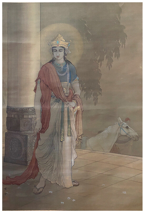 Additionally, with an examination of the Indian-themed works produced by the first Japanese artists in India, this paper also explores the earliest instances of Buddhist art conveying the ideology of Pan-Asianism: the modern belief of Asian unity against Western Imperialism, which was fervently promoted by Okakura, and one that emphasized the spiritual unity among Asian cultures, especially between India and Japan, to act as a counterbalance against Western materialism (Jaffe 2019, pp. 17–18). In his quest for Pan-Asianism, Okakura advised Japanese artists to study Buddhist art in India, which he claimed is a crucial source that could rejuvenate Japan’s traditional art. He encouraged his students to create art that embodies Asian values and artistic traditions as a counter against the influx of Western art in Japan, which he saw as threatening Japan’s traditions. His students took his advice to heart because, in their works, Okakura’s Pan-Asianism ideology manifested into innovative synchronizations of themes, styles, and iconographies between Indian and Japanese art as a symbolic unification between the two countries. They experimented with such synchronizations to embody Okakura’s version of spiritual Pan-Asianism, highlighting the religious bond between India and Japan.