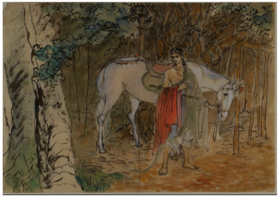 However, although Narihara’s analysis showed how Shōkin’s portraiture of Śākyamuni referenced many of his observations while in India, a little-known colored sketch (Figure 19) by Shōkin that also illustrated the story of Śākyamuni’s departure showed how the artist attempted a different approach in portraying Śākyamuni. It is unknown as to whether Katsuta drew this sketch as the original conception for Śākyamuni’s Departure or as a standalone piece. Regardless, similarities in the pose and color scheme of Śākyamuni’s figure from both works suggest a strong relationship. Like the painting, the colored sketch showed Śākyamuni alone, accompanied only by his horse. Unlike the painting, though, he was surrounded by tropical vegetation, and his attire differed quite drastically. Instead of an elaborate crown and jewelry, Śākyamuni’s robe offered few visual clues to his royal status save for a diadem, necklaces, and a sword. Most importantly, his right shoulder and chest were laid bare and he wore no shoes, making him closer in resemblance to the sketched monk figure from Shōkin’s notebook. The whole composition portrayed Śākyamuni closer to his persona as a forest ascetic than as a royal prince. Thus, it is plausible that this sketch was narratively the sequel to Śākyamuni’s departure where the prince reached the forests and discarded his royal attire.