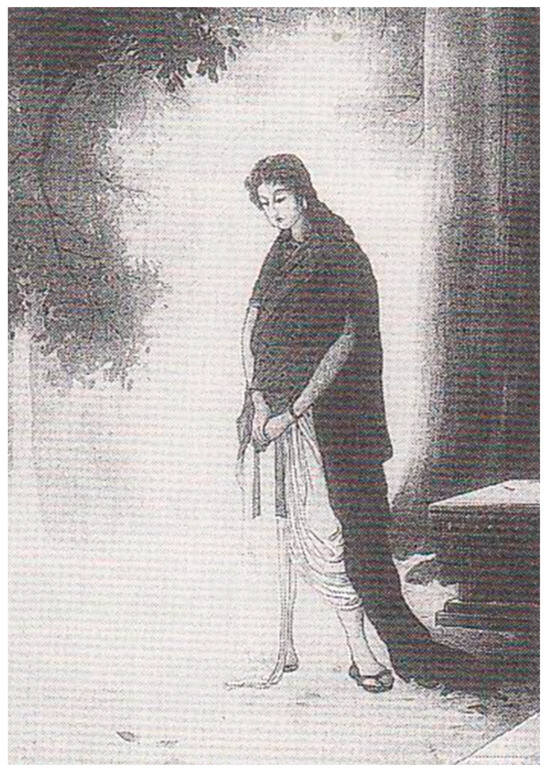 Following Śākyamuni’s Departure, Shōkin painted another version of Śākyamuni in the now-lost painting titled Prince Siddhārtha beneath the Jambu Tree (Enbujuka no Shidda Taishi, Figure 20) in 1908. This work portrayed him more as a religious figure than a historical prince. Although only photographic reproductions remain today, viewers can see how the painting diverged from Śākyamuni’s Departure. In the depiction, Shōkin abandoned rich jewelry and a confident posture in favor of a more reserved Śākyamuni, with his head bowed and hands clasped together at the front near his waist. Instead of a palace entrance, the background featured the titular Jambu tree near a stone platform. With this depiction, Shōkin aimed to create a sentimental painting that highlighted Śākyamuni’s spiritual devotion. However, when the painting was displayed at the first National Painting Achievement Association’s (Kokuga Gyokuseikai 国画玉成会) exhibition, which showcased various avant-garde Japanese-styled paintings by young artists, it received some harsh criticisms. One account mocked how Śākyamuni looked like “a urinating young prince”.10 Another criticism pointed out how Shōkin’s new version of Śākyamuni “appeared more like a foreigner [Westerner], and not like an Indian”.11