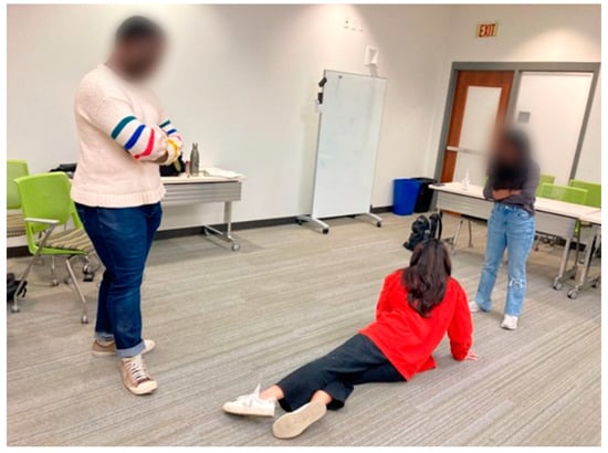 Near the end of the rehearsal, when a participant re-sculpted the image in Figure 1 into an “Ideal” solution, they resculpted the standing character on the right, positioning them to help the person on the ground. However, when the facilitator asked participants to move a step at a time from the original image to the “Ideal” image while remaining true to their characters, the character standing on the right held out their hands to the person in the middle of the floor but then took them away.