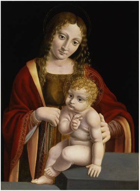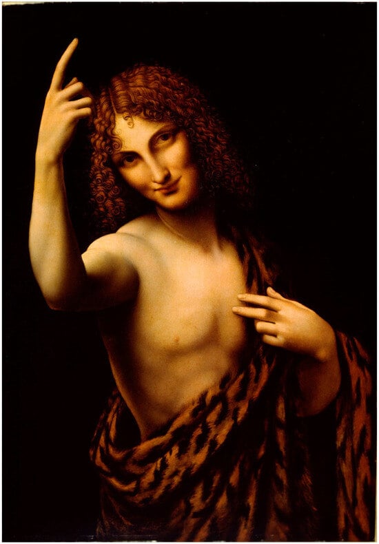 Giampietrino was not the sole progenitor of this striking iconography, which Titian so clearly appreciated. These pictures are intimately related to a body of works that emerged from Leonardo’s Milanese studio in the preceding years. This imagery continued to be popular and influential in northern Italy, and Giampietrino knew it well. The subjects are myriad: the Madonna, Christ, various saints and contemporary sitters (Figure 7, Figure 8, Figure 9, Figure 10, Figure 11, Figure 12 and Figure 13). All share a particular youthful, ephebic beauty—the careful construction of Leonardo and artists working under his aegis, including Giovanni Antonio Boltraffio, Marco d’Oggiono and Francesco Napoletano. The ideal in question is the result of considered and theoretically informed workshop practices. It is deliberately androgynous and was applied to both male and female subjects.79 Some are the forebears of Giampietrino’s Magdalene: near-naked holy figures whose potency derives from their youthful beauty. One subset of images features interchangeably John the Baptist or an angel (deemed the Angel of the Annunciation in the literature) (Figure 12 and Figure 13).80 The Magdalene borrows the gentle touch of fingertips to skin or hair, her tumbling corkscrew curls and her lithe perfection from them.