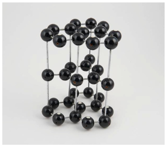 Because the human mind evolved to perceive time based on the comparatively slow movement of human-scale objects, the devastatingly fast movements of molecular phenomena are difficult to temporally perceive and comprehend. The representation of phenomena, such as electrons in orbit around an atom’s nucleus, historically relied upon static probability diagrams, or illustrations. These depict either impossibly solid objects, areas of possibility, or graphical forms that abstractly imply motion. My first visual memory of a carbon molecule was graphene—a sheet of carbon atoms covalently bound together in a single lattice of perfect hexagons. It was shown to us first as diagrams (see Figure 1). Later, we learned about graphite, the multilayered variant of graphene, using three-dimensional (3D) analog models (see Figure 2).