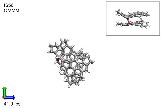 A second approach to time-ramping simulations is a hybrid simulation method. Martin et al.’s video (Martin et al. 2021; see Figure 3) shows two graphene molecules interacting within a flame over 41.6 picoseconds. The production of soot is an example of graphitization. Martin et al. created a hybrid simulation by merging two computational modeling approaches—Classic Molecular Dynamics (MD) and Quantum Mechanics/Molecular Mechanics (QMMM)—in order to increase the temporal and spatial detail around a specific event, i.e., the formation of the first bond between two layers of graphene. Typically, MD is a method for analyzing the physical movements of molecules and atoms, while QMMM allows the modeling of the electronic arrangements involved in creating chemical bonds. The motion of electrons is much faster (10−18 s or 1 attosecond) than the movement of atomic nuclei, and this comparison means scientists can algorithmically decouple the motion of the electrons from the motion of the atomic nuclei. To re-couple and synchronize MD and QMMM, you need a 0.2 fs timestep, and the simulation for this complex hybrid model was developed by Laura Pascazio (Martin et al. 2021).