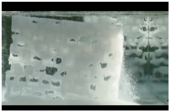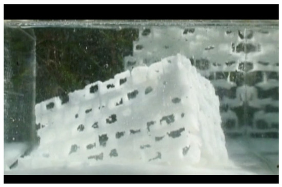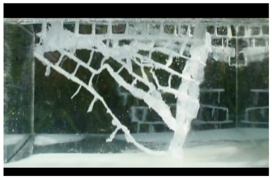 Richard Frater’s Sweet Apparition (Frater 2008) is a 19 min silent, durational video that shows a structure built from white sugar cubes slowly dissolving inside a fish tank. Karen Donnellan’s Arc (Wax and Wane) (Donnellan 2016–2017) depicts glass melting in real time; notably, this is one of few other examples of creative video that depict crystalline structures in a process of reformation—in this case from an ordered crystalline structure towards a disordered amorphic form. In Frater’s work, water is poured into the tank, and over time, the middle portions of each cube are the first sections to dissolve, leaving an intricate lace-like lattice—reminiscent of the diagrammatic crystalline structures in the previous scientific visualizations—that slowly folds to the ground as the structure dissolves. Although the dissolution begins quickly, and we see crystals of sugar falling rapidly from the structure (see Figure 4), and the structures have largely collapsed by the two-minute mark (see Figure 5), the dissolution of the skeleton remains mesmerizing, eventually floating to the top of the water bath (see Figure 6) in a kind of reverse collapse. The denouement of the work is not the final detachment of the sugar structure from the bottom of the tank but when movement stops occurring.
