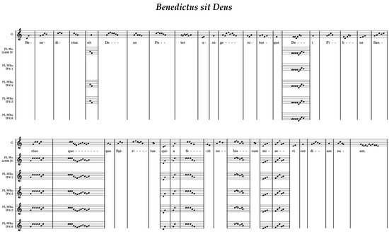 In all records, the antiphon Benedictus sit Deus (Figure 5) was recorded in mode III. In the Gniezno record, compared to the Cistercian versions, there are slight differences in the melody, consisting in the lack of repetition of the sounds on the words Dei, sanctus, quoque, fecit, and in slight changes in the shaping of the melody on some syllables of the words: sit, Dei, quia, nobiscum, misericordiam. In the Gniezno record, the sounds accompanying the second syllable of the word mi-se-ri-cor-di-am are written one tone higher than in the other codices; in turn, on the word quia, the melody begins with the same sound in all codices (re), but the melody continues differently: in the Gniezno codex re-mi-mi-la, and in the Cistercian sources re-sol-sol-do. The discrepancies between the Gniezno version and the Cistercian codices are most visible in the word quia, the second syllable of nobiscum and the first two syllables of misericordiam. Although melodies may come from one source, they have followed different paths of development.