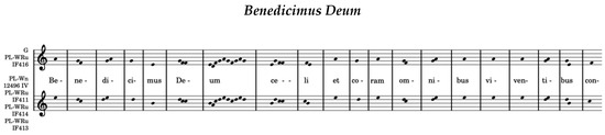 The melodics of Benedicimus Deum (Figure 6) are fully consistent with the Cistercian version. The only difference is that it—and one Cistercian melody—were transposed a fifth down in relation to the four Cistercian records. The scribes of G and PL-WRu IF 416 either made conscious transpositions or used some local pattern. The explanation for the transposition may perhaps be more the convenience of singers or notation. Transposition was also used to avoid the flat (Miazga 1977, p. 163). From the performers’ point of view, as long as interval relations within a melodic formula do not change, a chant remains the same in terms of modality. This is what happens in this case. Regardless of the transposition, the complete conformity of the Gniezno melody (15th century) with the Cistercian melody (13th and 14th century) indicates that the Gniezno scribe faithfully copied the Cistercian variant.