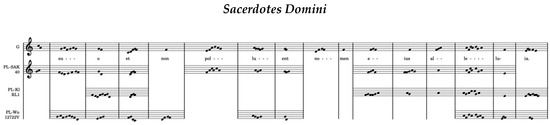 In this case, a stricter criterion that should be considered is the tonal qualification, which is not easily modified in the transmission of the liturgical repertoire (Kubieniec 2013, p. 137). In three sources (G, PL-SAK 40, PL-Kl RL 1) the antiphon is recorded in mode III, and in PL-Wn 12722 V in mode IV. Based on the CANTUS database, it is known that some sources classify the antiphon Sacerdotes Domini as mode I28. This means there is a lack of correspondence between different transmissions of the same repertoire. Therefore, it is impossible to establish permanent boundaries between musical traditions29.
