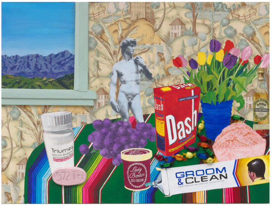 JT: I recognized that I was doing parodies of Wesselman still lifes. One of the things that I found interesting about them was that they are of their time. So whatever products he depicts, the logos and labels, the branding, is of the late ‘50s or 1960s, right? So, whereas, by the 1990s and ‘80s, everything had changed visually. I was specifically looking at imagery that came from the ‘60s or ‘50s because I was born in 1955. Some of these are old logos and older branded images. So it is even more likely that you’re not going to find them today. They’re adding to their “totally being made up” so to speak.