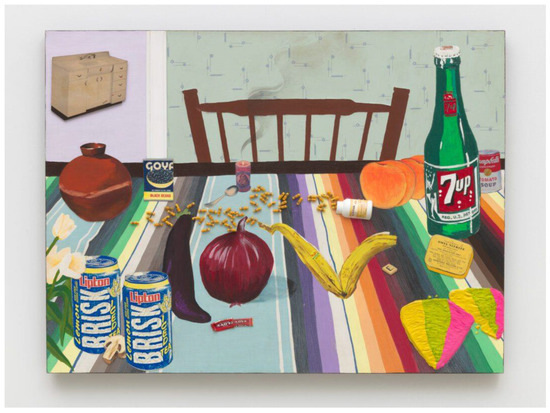 JT: Yeah, I think it’s Native American and I borrowed it from a book and I wanted to contrast it with a 1950s sink. I was looking through old magazines when I came across these kitchens and I thought, “Oh you know that’s the kitchen that I grew up with in Santa Fe Springs” and I thought, “How can I bring these small appliances in?” Because in these paintings, everything was always in the foreground. So I decided to put a wall in with trim to indicate a background and depth”. I also played with the items overall so that if you stretch your mind a little bit or smoke a joint, you could perhaps make out that the eggplant, onion, banana, and scrabble letter spell out “L”, “O”, “V”, “E”, and it’s repeated on the clove gum wrapper. So again, just playing with the idea of wordsmithing. And then these galletas have always fascinated me, the ones that are vivid dayglo pink, green, and yellow. A lot of non-Mexicans or non-Chicanos would say, “What are those exactly?” And this [Bite Me] (Figure 6) was loaned to the exhibit; it belongs to William Escalera and Francisco George. This is a still-life that does not contain HIV meds. I was thinking in terms of the cornucopia or horn of plenty showing abundance. Here, I decided to put an image from a Calvin Klein underwear ad from the ‘90s. It’s a still-life celebrating sensuality or sexuality and the title is provocative because it’s a rebuke to homophobic society but it can also be read as instructions to take a bite out of the fruit or the hunk. I also put the little angelito that’s usually pictured under the Virgen de Guadalupe, and so it’s sarcastic and sacrilegious.