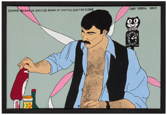 Joey Terrill, Summer Became an Endless Round of Parties, Said the Clone, acrylic on canvas, 24 by 36 inches, 2023. Reproduced with permission from the artist.